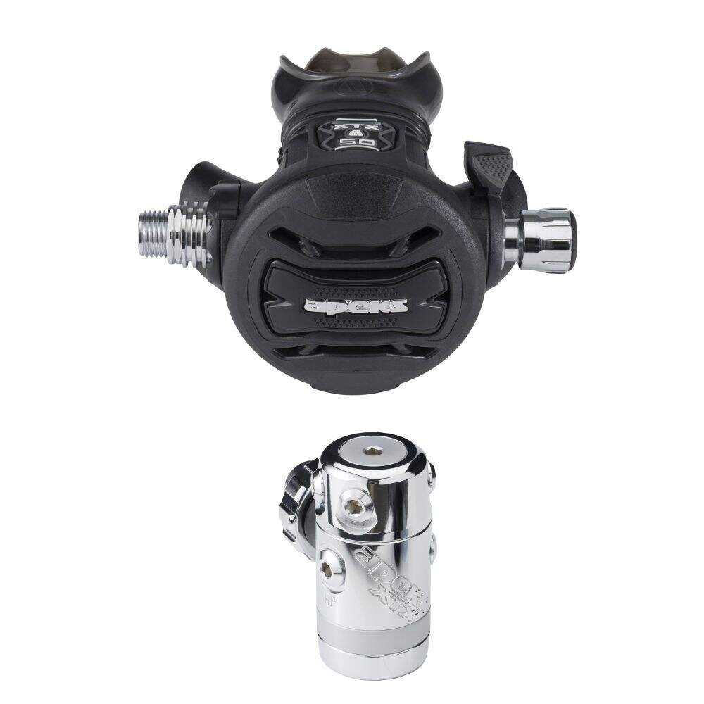 DS4 first stage with over-balanced diaphragm and environmental dry system. Pneumatically-balanced XTX second stage with two-stage purge, venturi lever, silicone exhaust valve, Comfo-biteβ’ mouthpiece, antimicrobial molded parts and patented heat exchanger.