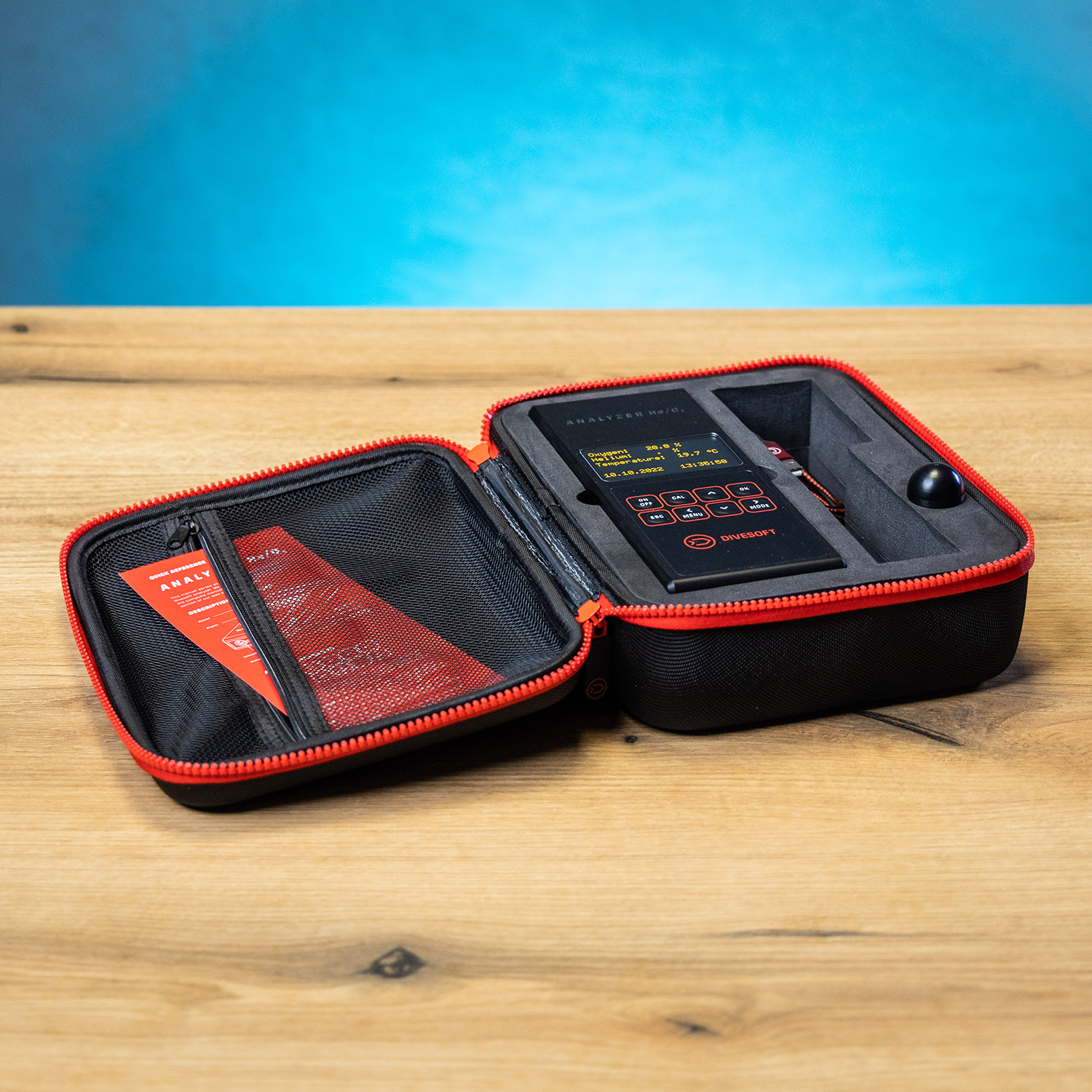Analyzer He/O2 is a precise apparatus for measuring oxygen helium concentrations in diving breathing gasses. It is a necessary tool for technical divers using nitrox and trimix mixtures.